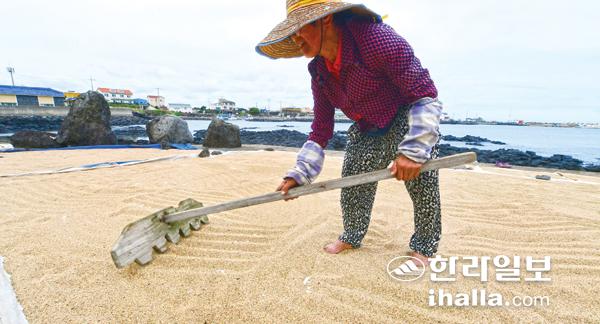 14일 제주시 한림읍 수원리 해안 공한지에서 마을 주민이 수확을 마친 기장을 말리고 있다. 강희만기자