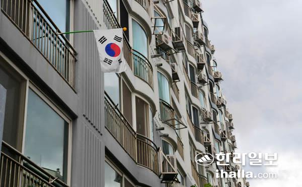 제헌절인 17일 제주시 노형동 한 아파트단지내 한 가정에 게양된 태극기가 외로이 바람에 펄럭이고 있다. 강희만기자