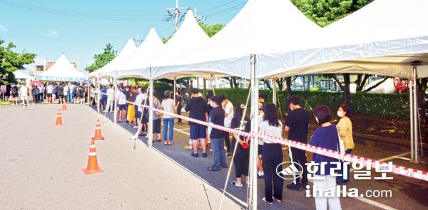 30℃가 훌쩍 넘는 폭염이 이어진 19일 제주시 제주보건소 선별진료소에 햇빛을 가리기 위한 그늘막이 설치됐다. 검사를 받으려는 시민들이 그늘막 아래서 줄을 서서 차례를 기다리고 있다. 이상국기자