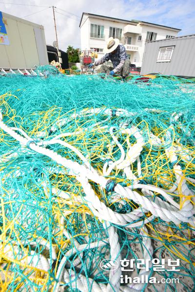 20일 제주시 조천읍 한 어민이 조업에 쓸 그물을 만들고 있다. 이상국기자