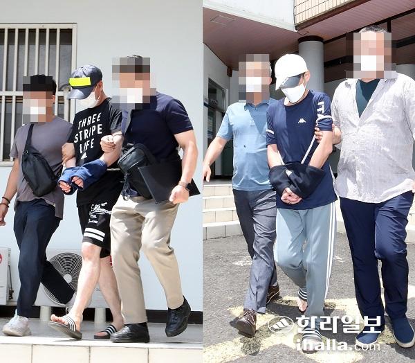 21일 중학생을 살해한 백모(46·사진 왼쪽)씨와 김모(46)씨가 영장실질심사를 받기 위해 제주동부경찰서에서 법원으로 향하고 있다. 강희만기자