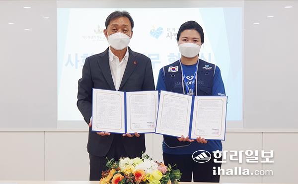 제주경제통상진흥원(원장 문관영)과 (사)함께하는사랑밭 제주지부(지부장 박소민)는 지난 20일 제주경제통상진흥원 회의실에서 복지사각지대에서 어려움을 겪는 이웃들을 위한 사회공헌 협약을 체결했다.