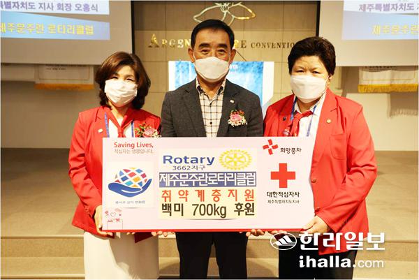 제주문주란로타리클럽(회장 조영금)은 지난 19일 아젠토피오레 대연회장에서 대한적십자사제주특별자치도지사(회장 오홍식)에 취약계층 지원을 위한 백미 700㎏(약 230만원 상당)을 기탁했다.