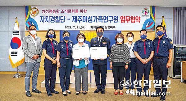 제주여성가족연구원(원장 민무숙)과 제주특별자치도 자치경찰단(단장 고창경)은 21일 자치경찰단에서 인권 가치 제고와 양성평등한 조직문화 조성 그리고 지역사회 양성평등 문화 확산을 위한 업무협약(MOU)을 체결했다.