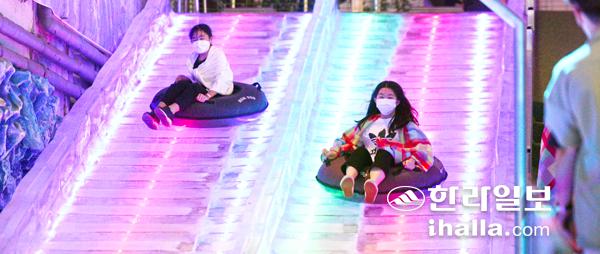 21일 제주시 수목원 테마파크 아이스뮤지엄을 찾은 어린이들이 얼음썰매를 타며 더위를 잊은듯 즐거운 시간을 보내고 있다. 이상국기자