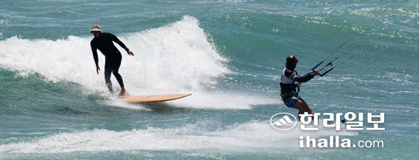무더위가 이어진 22일 서귀포시 안덕면 사계리 해안를 찾은 한 서핑동호인이 바람을 이용한 카이트 서핑을 즐기며 스릴을 만끽하고 있다. 강희만기자
