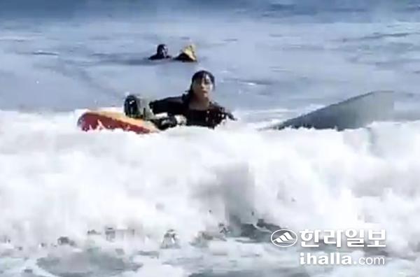 이정우 경장이 중문해수욕장에서 이안류에 떠밀린 50대 여성을 구조하는 모습. 사진=제주지방해양경찰청 제공