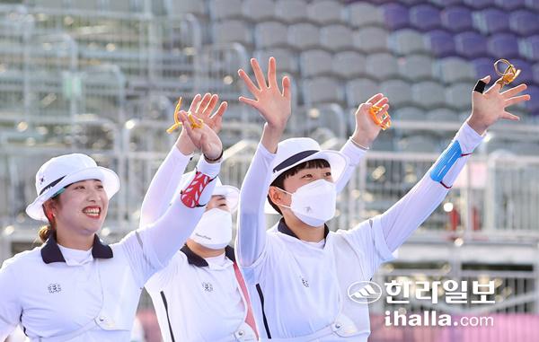 25일 일본 도쿄 유메노시마 공원 양궁장에서 열린 양궁 여자단체전 결승전에서 금메달을 획득한 장민희, 강채영, 안산이 관람석을 향해 손을 흔드록 있다. 연합뉴스