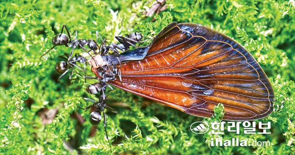 24일 제주시 사려니숲에서 개미들이 자기 몸집보다 훨씬 큰 매미날개를 물고 이동하고 있다. 강희만기자