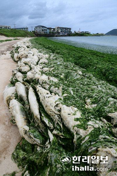 기괴한 '파래산성'26일 서귀포시 성산읍 시흥리 해안에 제주 해변의 골칫거리인 파래가 돌담처럼 쌓여 미관을 해치고 있다. 강희만기자