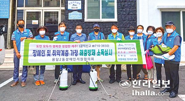 제주시 용담2동 장애인지원협의회(회장 김영호)는 지난 23일부터 3일간 관내 장애인 75가구에 대한 실내외 해충방제 및 위생소독 방역을 실시했다.