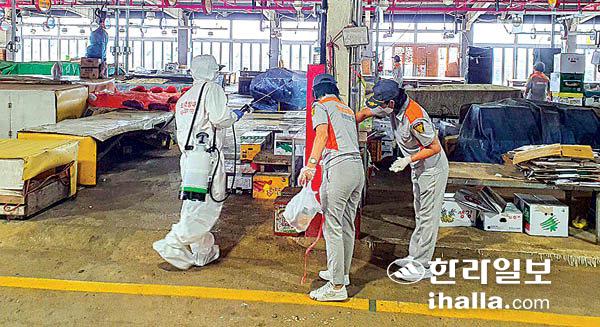 제주동부소방서 의용소방대연합회(회장 김봉민)는 지난 23일 제주시 구좌읍 세화오일시장 일대에서 '코로나19 대응 공공시설 방역지원' 활동을 펼쳤다.
