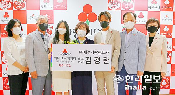 (주)제주사랑렌트카 김경란 대표가 1억원 기부를 약정하며 제주사회복지공동모금회(회장 김남식·이하 제주사랑의열매) 고액 기부자 모임 아너 소사이어티(Honor Society)에 27일 가입했다. 김경란 대표는 제주 아너 소사이어티 117호 회원이자, 전국 2665번째 회원으로 등록됐다.