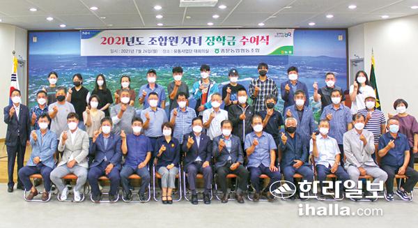 중문농협(조합장 김성범)은 지난 26일 중문농협 유통사업단 대회의실에서 임직원 등 40여명이 참석한 가운데 장학금 수여식을 갖고, 조합원 자녀 중 올해 대학교에 입학한 신입생 69명을 선정해 1인당 100만원씩 총 6900만원을 전달했다.
