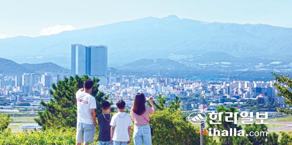 맑은 날씨를 보인 28일 제주시 도두봉을 찾은 관광객들이 한껏 다가선 제주시와 한라산을 신비한듯 바라보고 있다. 이상국기자
