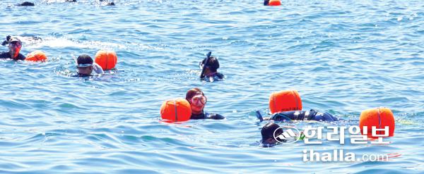 올해들어 가장 무더운 날씨를 보인 28일 제주시 한림읍 바다를 찾은 관광객들이 해녀체험을 하고 있다. 이상국기자