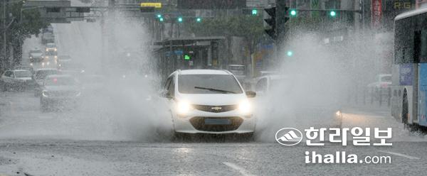 폭우가 쏟아진 지난달 31일 제주시청 앞 도로를 차량들이 물보라를 일으키며 지나고 있다. 이상국기자