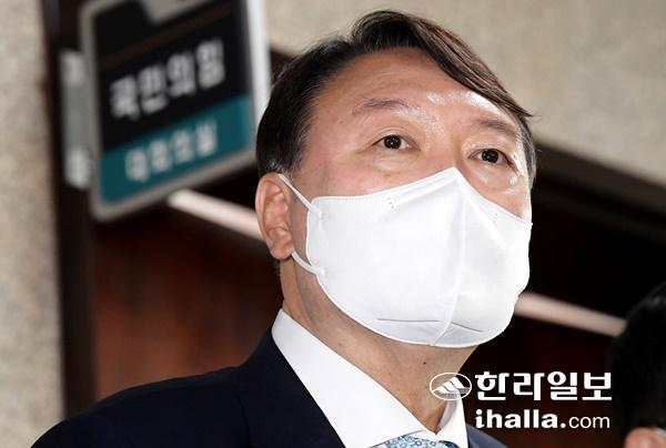 국민의힘 윤석열 대선 예비후보가 2일 오전 서울 여의도 국회에서 이준석 당 대표와 김기현 원내대표 및 최고위원들을 예방한 뒤 취재진의 질문에 답하고 있다. 연합뉴스