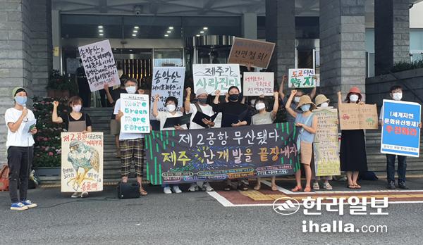 6개 환경시민단체들이 2일 제주도청 앞에서 기자회견을 열고 구호를 외치고 있다.