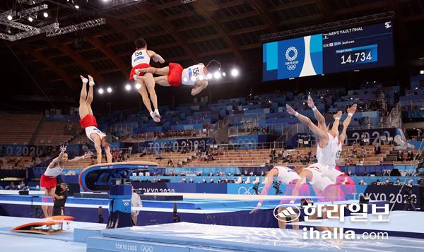 2일 일본 아리아케 체조경기장에서 열린 도쿄올림픽 남자 기계체조 도마 결선에서 신재환이 연기하고 있다. 다중 촬영. 연합뉴스