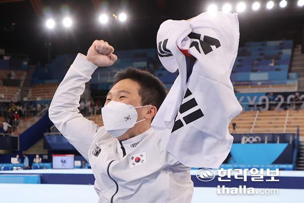 2일 일본 아리아케 체조경기장에서 열린 도쿄올림픽 남자 기계체조 도마 결선에서 금메달을 획득한 신재환이 태극기를 흔들며 환호하고 있다. 연합뉴스