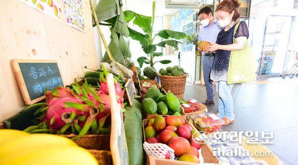 2일 '기후변화와 제주농업, 열대과일 & 로컬푸드' 기획전이 마련된 제주담을센터를 찾은 고객들이 제주산 열대과일을 살펴보고 있다. 이상국기자