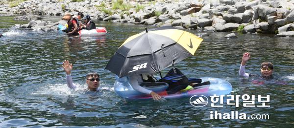 더위가 절정을 치닫고 있는 가운데 3일 서귀포시 강정천을 찾은 시민들이 물놀이를 하고 있다. 이상국기자