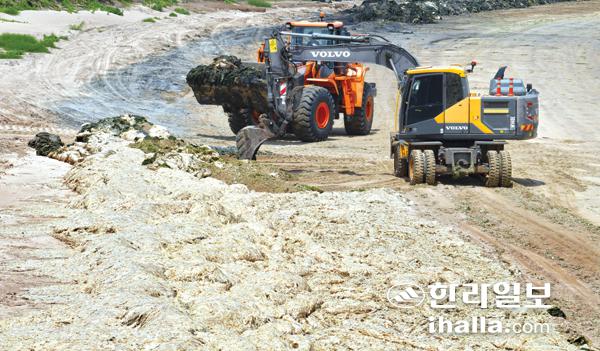 3일 서귀포시 성산읍 시흥리 해안에서 제주동부해안 불청객인 파래 수거를 위해 행정당국에서 중장비를 동원해 수거작업을 벌이고 있다. 강희만기자