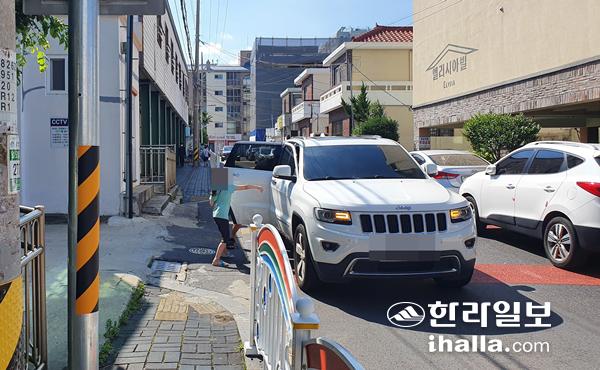 4일 제주시 인화초등학교 부근 통학로에 차량들이 불법주차돼 있어 학생들이 도로로 이동하고 있다.
