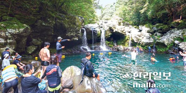 무더위가 이어진 4일 서귀포시 돈내코 원앙폭포를 찾은 도민과 관광객들이 얼음처럼 차가운 폭포수에 더위를 식히며 재충전을 하고 있다. 이상국기자
