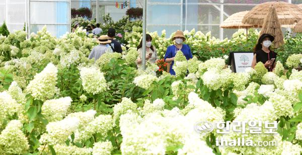 4일 서귀포시 휴애리자연생활공원에 활짝 핀 유럽수국이 관광객들의 시선을 사로잡고 있다. 이상국기자