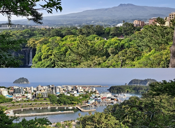 서귀포시공원에서 바라본 한라산과 천지연폭포(사진 위쪽). 그리고 전망대에서 마주 선 서귀포항 일대의 모습. 한라일보DB