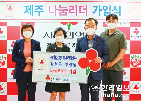NH농협은행 제주영업부 강정금 부장은 5일 도내 어려운 이웃을 돕고자 제주사회복지공동모금회(회장 김남식)가 진행하는 '제주 나눔리더'에 88호로 가입하고 나눔문화 확산에 앞장섰다.