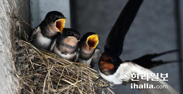7일 서귀포시 표선면 성읍리 한 건물 처마에 둥지를 튼 제비가 새끼들에게 먹이를 주고 있다. 강희만기자
