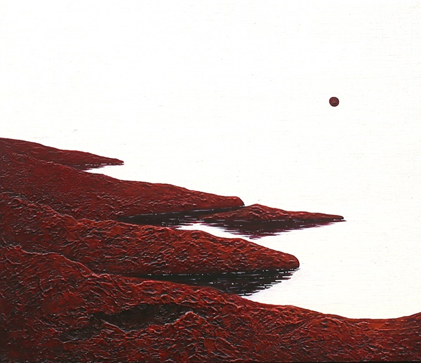 캔버스에 아크릴물감으로 작업한 '홍월'에선 바다로 뻗은 붉은 바위 너머 붉은 달이 떠 있는 장면을 묘사하고 있다. 어떤 이는 이 작품을 보며 태초의 제주 섬을 떠올렸다고 한다. 화산에서 분출한 뜨거운 용암이 흘러 흘러 바다까지 다다르는 순간이 그럴까. 검붉은 바위가 마치 이 섬의 오랜 생명력을 말해주는 듯 하다.