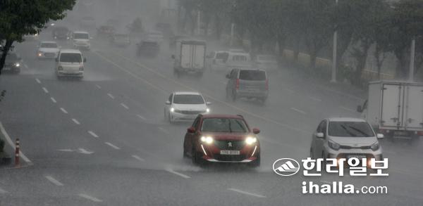 10일 오후 제주시 봉개동 번영로에 갑작스럽게 폭우가 내리자 차량들이 전조등을 켜고 서행하고 있다. 이상국기자