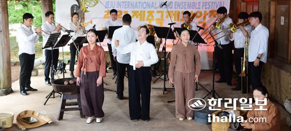 2021 제주국제관악제 프로그램으로 12일 제주돌문화공원에서 '우리동네 관악제'가 열린 가운데 젊은 관악 연주자들로 구성된 브라스피플의 연주에 맞춰 제주농요보존회 회원들이 제주민요를 부르고 있다. 지난 8일 개막한 제주국제관악제는 광복절인 15일 개최되는 경축음악회를 끝으로 여름 시즌의 막을 내린다. 이상국기자