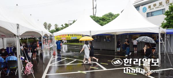 비가 내린 12일 제주시보건소 선별진료소를 찾은 시민들이 우산을 쓴 채 진단검사를 기다리고 있다. 이상국기자