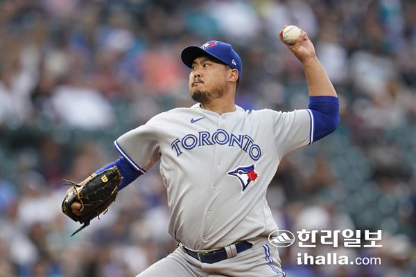 한국 시간 광복절에 시애틀 상대로 역투하는 류현진. 연합뉴스