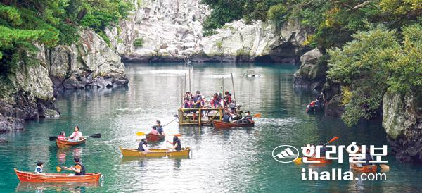 15일 서귀포시 쇠소깍을 찾은 관광객들이 전통테우와 나무카약을 타면서 즐거운 한때를 보내고 있다. 이상국기자