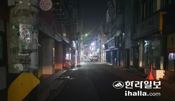 이보다 앞서 지난 17일 오후 11시쯤 제주시청 대학로 일대엔 사람이 거의 없어 적막감이 흘렀다. 대부분의 상점가 간판 불은 꺼져 있었고, 배달 오토바이들만 돌아다녔다.