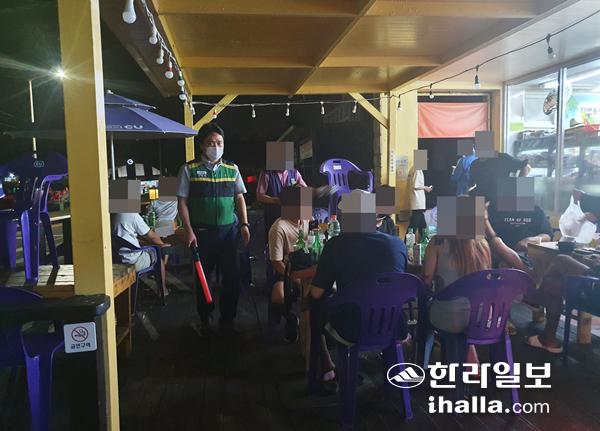 18일 0시부터 사회적 거리두기 4단계로 격상되자 단속공무원이 제주시 이호해수욕장 인근 편의점에서 술판을 즐기고 있는 노상객들에게 해산해달라고 요청하고 있다.