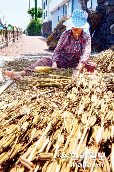 18일 제주시 구좌읍에서 한 농민이 수확 후 땡볕에 바짝 마른 참깨를 털고 있다. 이상국기자