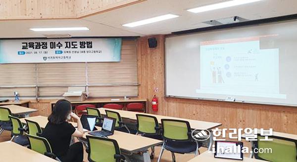 서귀포여자고등학교(교장 김월룡)은 지난 17일 세종 양지고등학교 이복희 교사를 강사로 초빙해 1, 2학년 담임 교사 및 저경력 교사 31명을 대상으로 '고교학점제 교육과정 이수 지도 방법' 연수를 진행했다.
