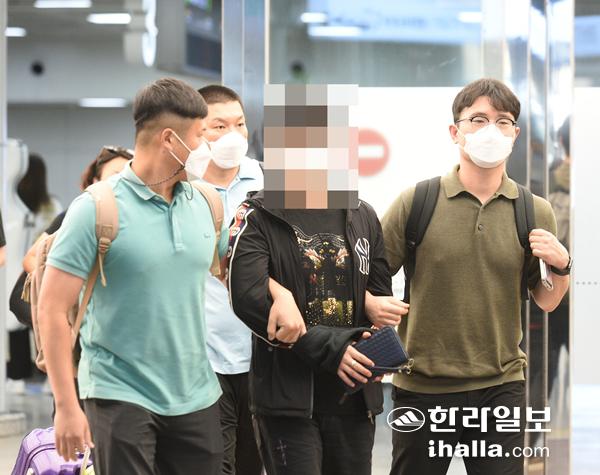 제주경찰청은 1999년 제주에서 발생한 변호사 피살 사건에서 살인교사 혐의를 받는 김모씨를 인터폴 공조를 통해 검거해 강제 송환했다고 20일 밝혔다. 지난 18일 오후 경찰이 검정색 상하의를 입은 김씨를 제주국제공항을 통해 제주경찰청으로 압송하고 있다. 이상국 기자