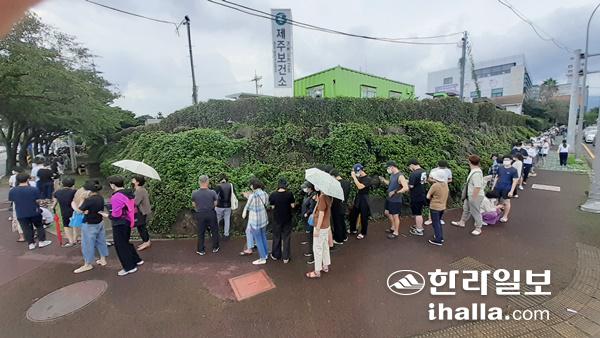 제주시 노형동 소재 이마트 신제주점에서 확진자가 발생, 22일 동선이 공개되면서 23일 제주보건소에는 코로나19 진단검사를 받기 위한 줄이 길게 이어지고 있다. 강희만 기자