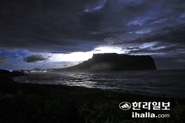 제12호 태풍 오마이스가 제주를 지나간 23일 밤 제주 서귀포시 성산읍 성산일출봉 모습. 연합뉴스