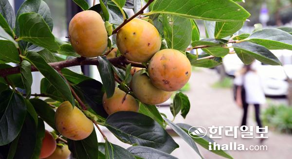 여름의 기운이 꺾인다는 처서가 하루 지난 24일 제주시 이도동 도로변 감나무에 감들이 익어가고 있다. 강희만기자