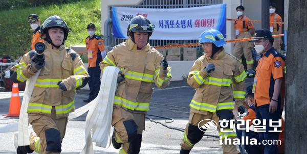 26일 제주소방교육대에서 소방공무원 현장대응능력 강화를 위한 '2021 전도 소방기술경연대회'가 진행된 가운데이 대회에 참가한 서귀포소방서 대원들이 가상의 화재 진압을 위해 분주히 달려 가고 있다. 강희만기자