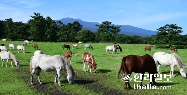 계속되는 비날씨 끝에 맑은 하늘이 드러난 26일 제주시 제주마방목지에서 천연기념물로 지정된 조랑말들이 한가로이 풀을 뜯고 있다. 강희만기자